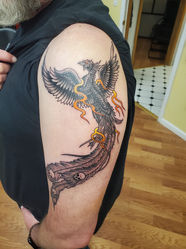 Fritz began tattooing in 1989 in the college town of Greenville North Carolina where he was an art major at East Carolina University. After learning the tattoo critical disciplines of drawing, color theory, and composition he moved to Albemarle North Carolina to open his first shop. After a year there he moved to Charlotte and spent his formative years in a 'street shop' where he did a mix of custom and pre-designed art. In 1996 he moved to Colorado where he spent 7 1/2 years in very busy street shop; this time learning the business aspects of tattooing. In 2004 he moved to SW metro to open his 3rd career shop; this time focusing mainly on custom work. With all those years in street shops, he developed competency in most tattoo styles, but mainly enjoys Fineline, Black and Grey, Blackwork, Geometric, Traditional Japanese, Neo-Traditional, and Colored Illustrative. Fritz is also a self-proclaimed Cover-up wizard. Fritz's great love in tattooing is teaching; bringing over a dozen successful tattooers into the fold. Fritz is married, loves French bulldogs, fishing, motorcycle riding, and creating 3D art out of metal and wood. His favorite 2D art media is pen and ink illustration and acrylic paint.